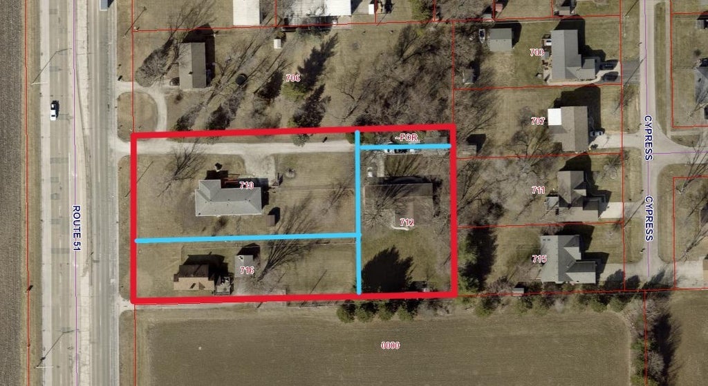 Unique opportunity to purchase 4 parcels in Forsyth with a combined 1.77 acres and frontage on Route 51. So many possibilities for this property! There are 3 homes (710, 712 and 716), which could be converted to commercial/office space or rental income. 710 is currently a rental and is front facing to Rte 51- this is a two bed/1 bath open concept ranch home with 2-car attached garage and could easily be converted to an office. 712 is tucked behind 710 and is a beautifully remodeled 3 bed/2 bath ranch that could remain a residence, or could be converted into office space. 716 could be converted to office space, or parking. Two driveways bookend the combined parcels-710 & 712 share a driveway with northbound entry and 716 has a dual entry from Rte 51. There are also 2 detached garages on the property. *All 4 parcels are currently zoned residential-contingent upon rezoning desired parcels to commercial upon receipt of LOI from potential buyer. TIF District-potential developer incentives!